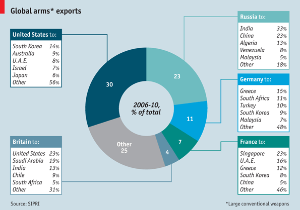 Таким образом, в стоимостном выражении США в 2010 году заняли около 42 процентов мирового рынка вооружений. Следует отметить, что по объемам поставки военной техники этот показатель может оказаться значительно меньше, поскольку американское оружие является самым дорогим на рынке. Например, в 2009 году в стоимостном выражении доля США на международном рынке составила около 60 процентов. Между тем, по оценке Стокгольмского международного института исследования проблем мира (SIPRI), доля США на мировом рынке в 2009 году составила 30 процентов. SIPRI рассчитал этот показатель исходя не только из стоимости вооружений и военной техники, но и с учетом их фактических поставок.